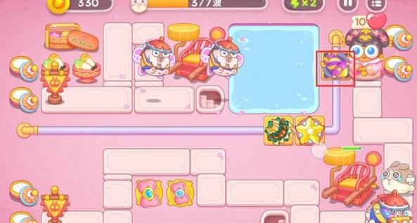2、第二步,右边再放一个蝴蝶结炮台,有钱就升级。这时候滑竿上的箱子已经被打得差不多了