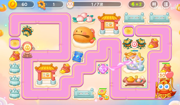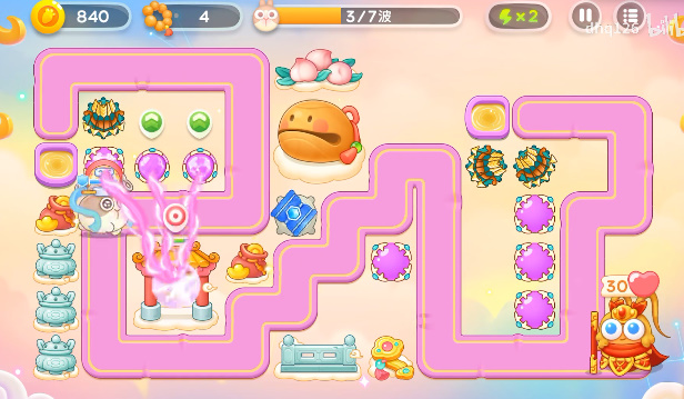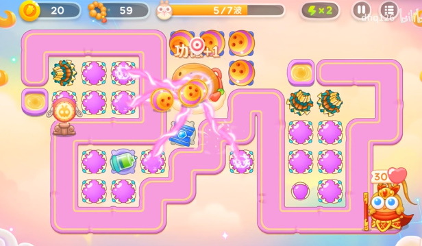 1、开局放上一个双向炮就可以一边打怪一边清理道具了,有空位就补充魔法球,在放上两个多重箭即可。