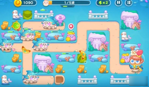 1、利用第一轮留下的回旋镖和船锚,清理掉路上的障碍物。放置鱼雷塔,对水下的敌人进行攻击。配合第一轮的塔,抵挡住第一波的进攻。