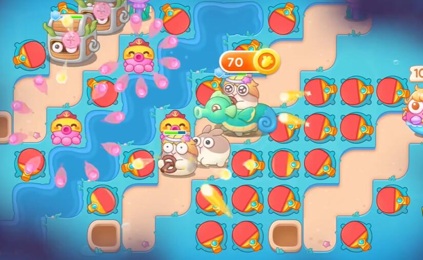 1、保卫萝卜4海的闺女第47关首先在右边的位置放置几个球拍用来开图,对来袭的兔子进行清理。