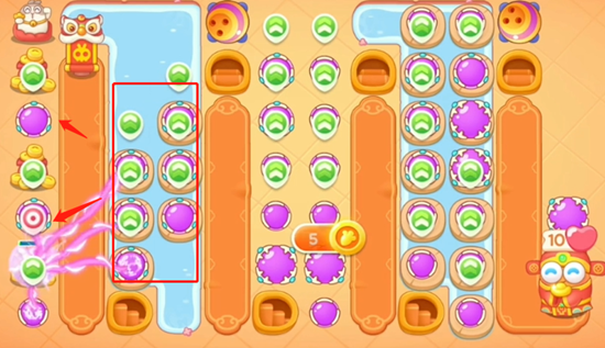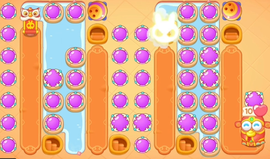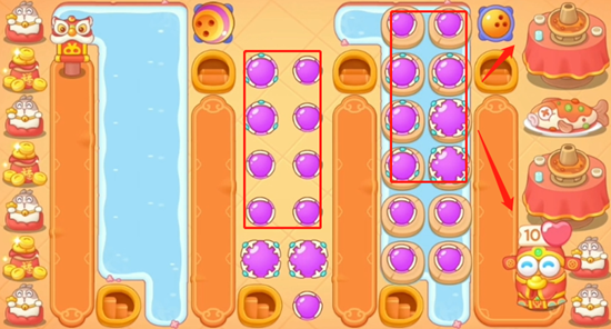 3、左侧水中还没有木板,所以我们把中间和右侧的道具全部清理完之后,左侧出现木板打掉放置炮台清理左侧道具。