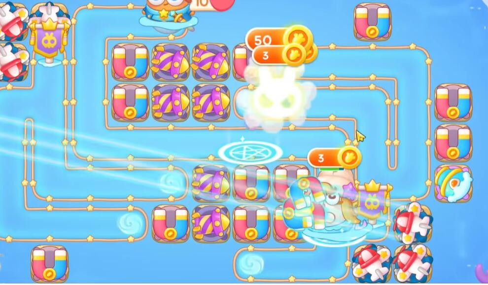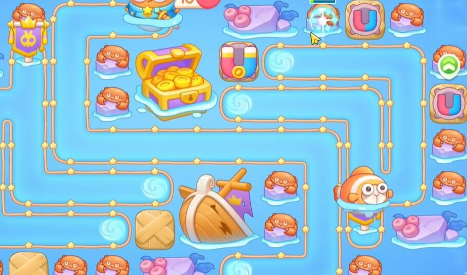 1、保卫萝卜4海的闺女第70关开始时搭建吸铁石炮台,攻击中间的宝箱获得丰厚的萝卜奖励。