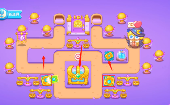 2、打掉宝箱之后,获得四个太阳花,先不要着急升级,使用卡牌打掉天平放置忍者镖,然后清理上面道具,