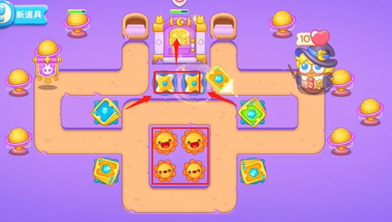 1、开始我们先在宝箱两边放置卡牌,快速打掉上面的道具,然后打掉第一波兔子,继续放置卡牌集火宝箱打。