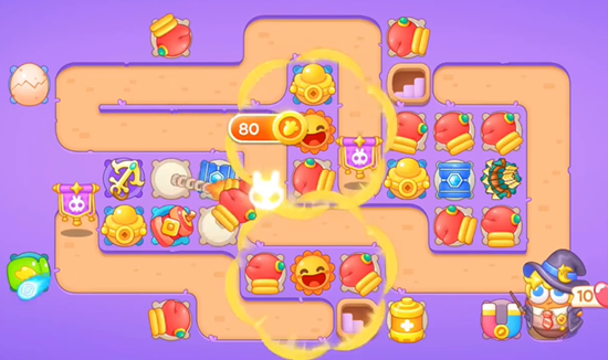 2、场上会有给炮台的兔子,我们第一时间打掉他,可以获得各种炮台,空闲时间我们使用这些炮台清理周围的道具。