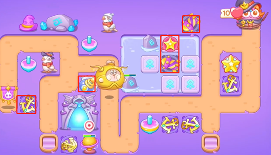 1、开局我们先在中间位置放置船锚,然后打掉周围的道具,可以在出口这里放置陀螺对兔子进行攻击。