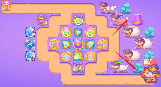 3、我们先把左边这里的道具给清理完之后,再在右边同样是放置炮台清理掉右边的道具,拿到全清。