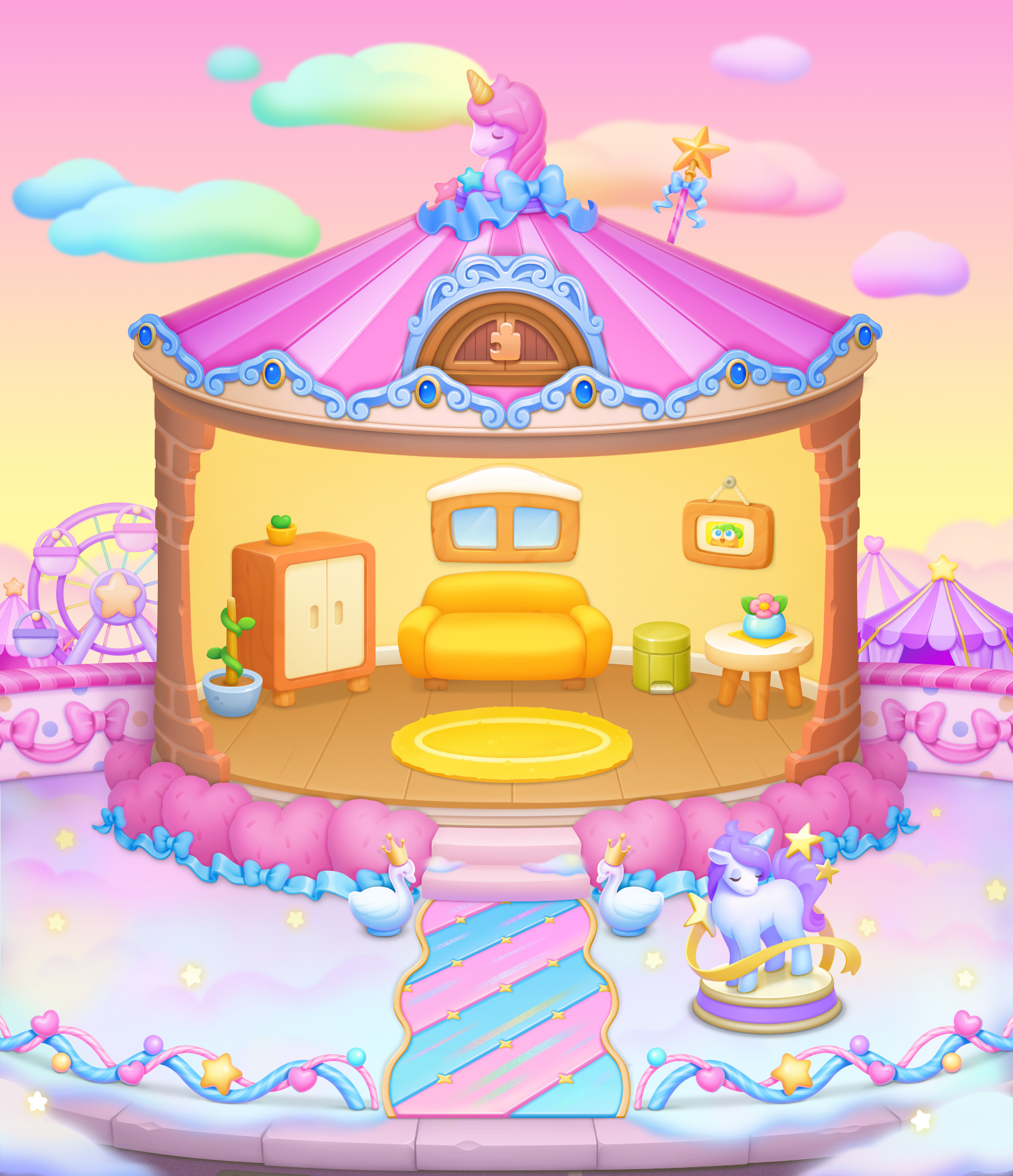 参与「周年庆」限时活动,获取限定「梦幻城堡」主题室外装扮!渐变云朵交织在天际,给阿波公寓带来了无尽的浪漫!护栏、地板、道路都被装扮成梦幻的粉紫色,让人仿佛置身于童话般的世界。