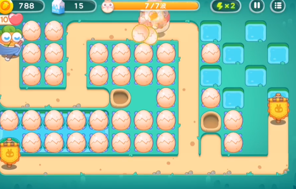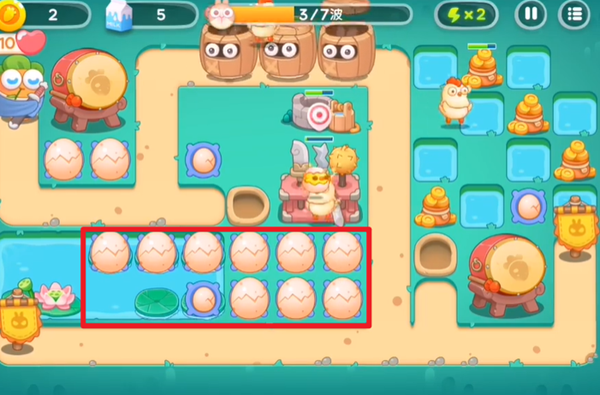 1、首先在左侧的池塘建造鸡蛋壳,拆上方的一个道具,右侧的位置放一个蛋壳来打怪,在怪物来之前也可以清道具。