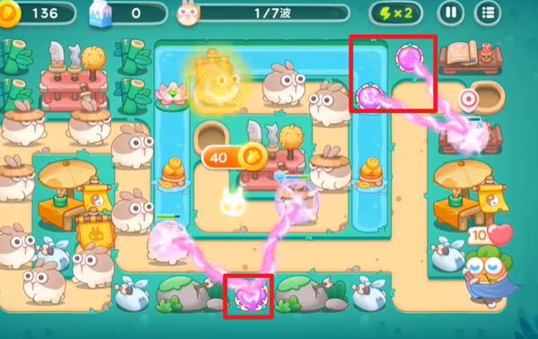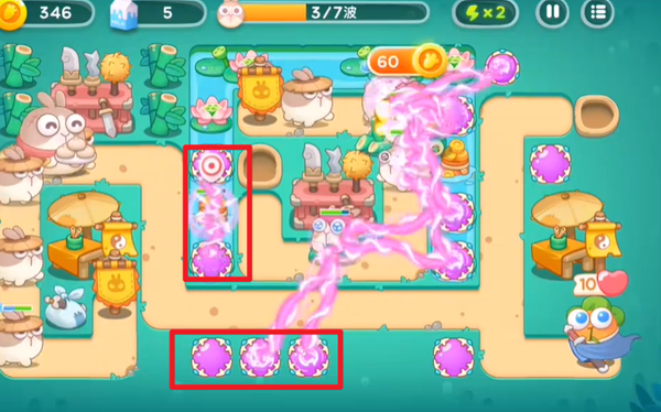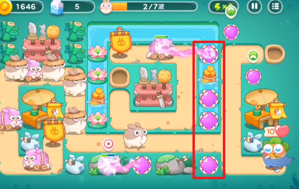 1、在中间下方优先放置一个满级的魔法球炮塔,这个炮塔主要用来攻击怪物。同时,在右上角放置几个魔法球,让它们去清理道具。这样的布局可以在怪物出现的初期就给予一定的攻击压力,同时为后续的道具清理工作做好准备。