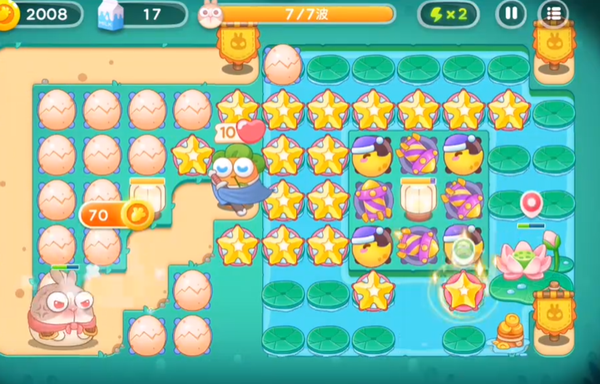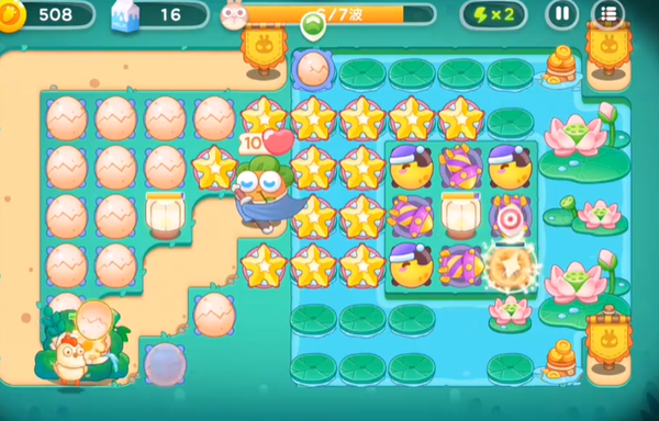 6、将左边和右边接近道路的格子全部摆放炮塔,左边是鸡蛋壳,右边是星星。