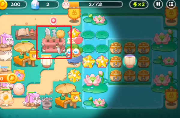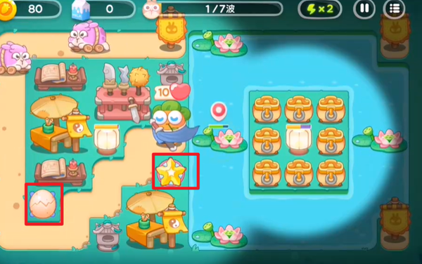 1、首先在萝卜的下方放置一个星星炮塔,然后瞄准右边的道具,用来开格子,左下角的蛋壳打怪物。