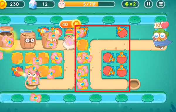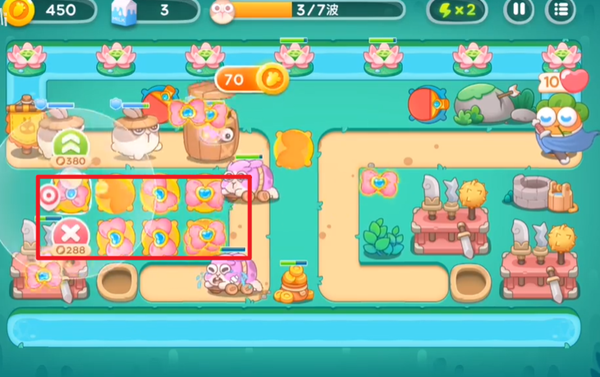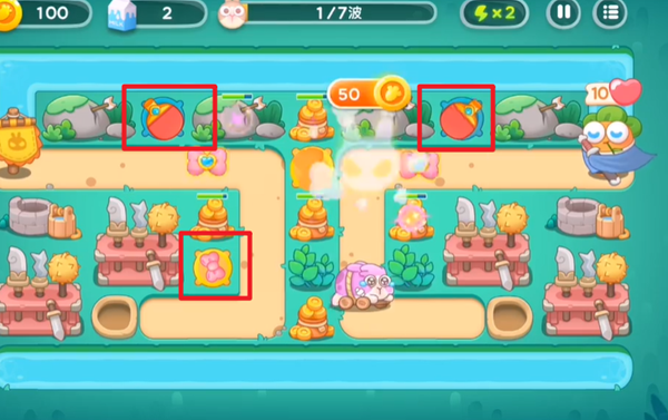 2、完成开局在右侧的建造后,接着在中间和左侧各建造一个满级的蝴蝶结,然后利用这两个满级蝴蝶结继续清理右侧的钱袋。钱袋被清理后可以获得一定的资源,有助于游戏的发展。