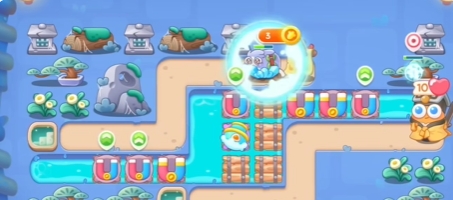2、先在右侧的水池中建造两个满级磁铁,集中火力清理下方的道具。