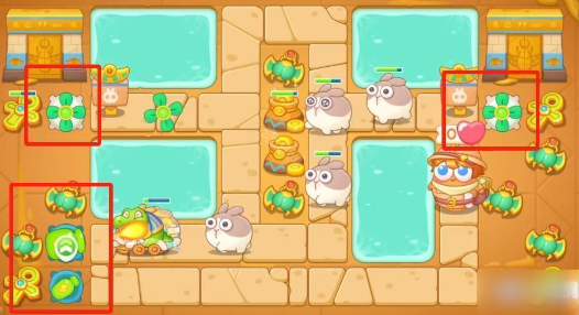 2、将瓶子炮塔升级到满级,然后在水面上面建立拳套,一边攻击道具,一边攻击兔子。