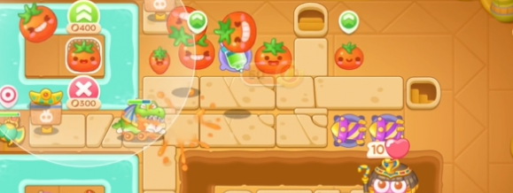 3、将上方的道具清除后,在水池中和右上角建造番茄炮台并升级。