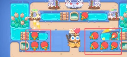 1、首先,于屏幕底部的两端部署两个乒乓球发射器,它们的作用是清除周边的道具。