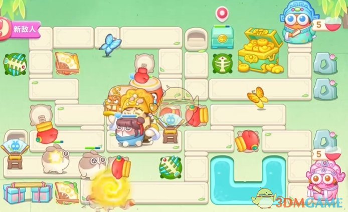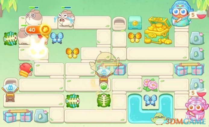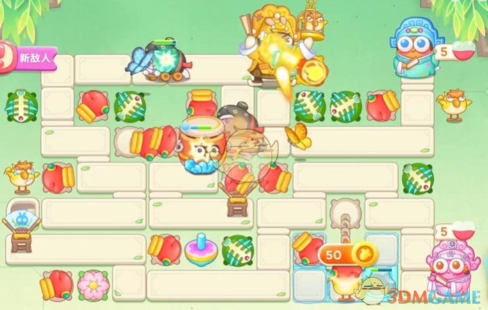 1、开局在左侧建立蝴蝶伤害防线,中间下方的鱼骨清理残血和道具;