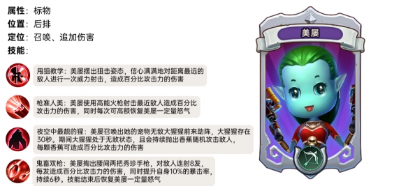 技能效果:美屡召唤出宠物大猩猩,大猩猩存在30秒,期间大猩猩处于无敌状态,且会持续抛出香蕉随机攻击敌人,每颗香蕉可造成百分比的攻击力的伤害。