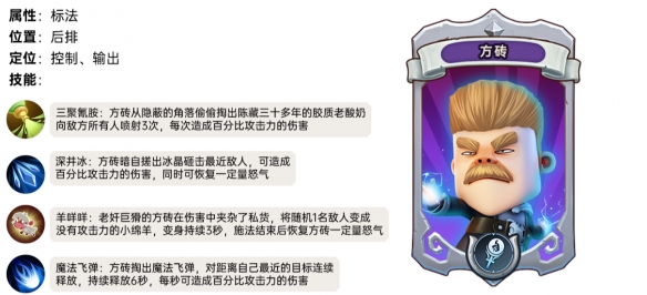 方砖掏出魔法飞弹,对距离自己最近的目标连续释放,持续释放6秒,每秒可造成百分比攻击力的伤害