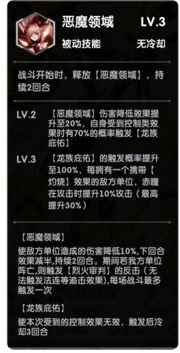 被动技能:恶魔领域。提供伤害效果降低的同时,还有附加免控,同时每有一个敌方单位灼烧效果,则我们的赤瞳就会增加10%攻击力,最高可直接30%!这说明了什么?说明了只要我们带个可以给对方大多附加灼烧的英雄,我们的赤瞳攻击就能提高30%!这又提高了一个档次。