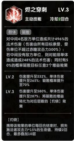 一技能:烬之穿刺。则是对中间4名敌方单位造成高额伤害,同时还有百分之50驱散目标2个增益效果,满级时还可以转化为灼烧效果,自己给自己加伤害呢这是,是一个神技。