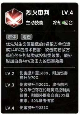 二技能:烈火审判。对3名生命值最低的敌方单位造成伤害的同时,若敌方单位存在灼烧或控制效果,则会额外附加自身40%攻击力的伤害效果,3级技能的时候,则还会额外提供自身50%暴击率,20暴击伤害。这说明了只有我们给对方附加灼烧和控制效果,则我们的赤瞳伤害就会拉满,并且会提高一个档次。