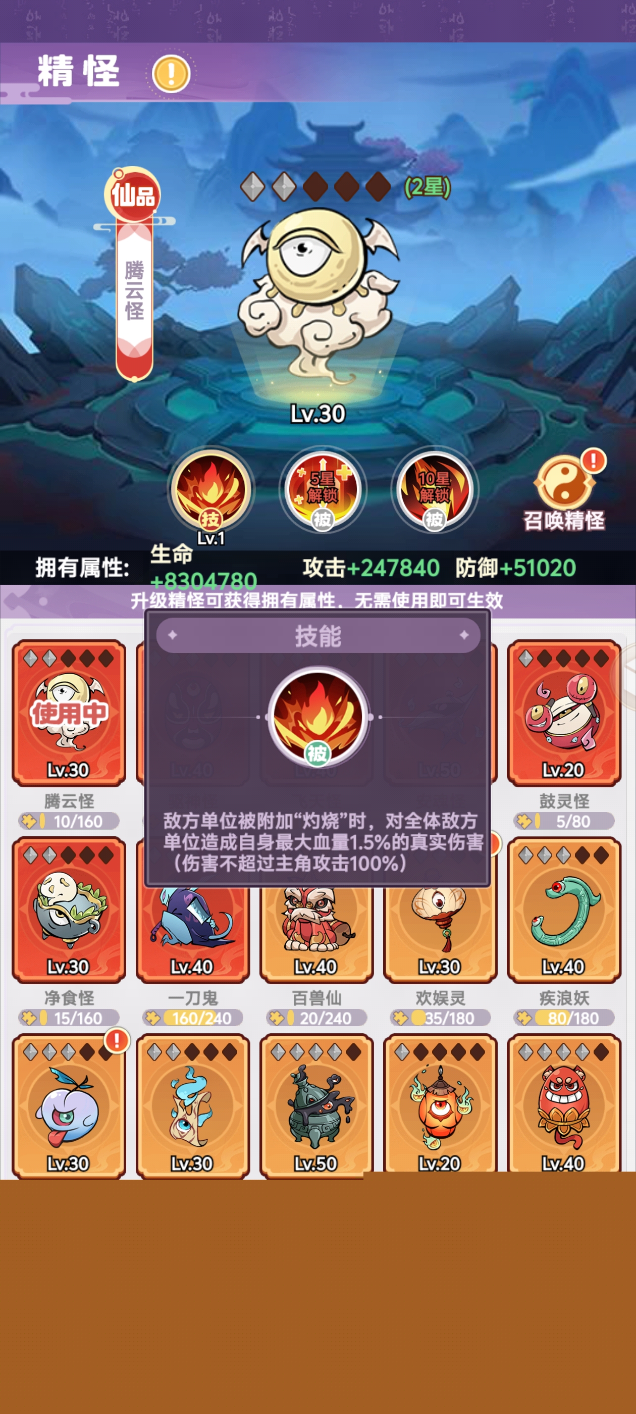 腾云怪:敌方被施加燃烧时对全员造成1.5%血量的伤害(不超过主角攻击力的100%)。