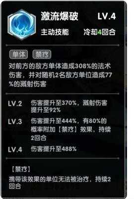 月河二技能:激流爆破。满级时对前方单体造成488%巨额法术伤害,同时还随机对2名敌方单位造成77%的溅射伤害,还有80%几率附加禁疗效果。可以说是输出很高的技能!