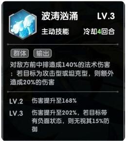 月河一技能:波涛汹涌,打前中排,对攻击型和防御型英雄造成额外伤害,同时3级技能对负面状态的英雄,无视其百分之15的防御,我们前面已有减速,所以我们的伤害可以拉满。