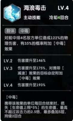 【中毒】携带该效果的单位每回合结束时,损失{生命增上限*5%}的生命值,最高不超过攻击力的2.5倍,最多叠加5层,持续2回合