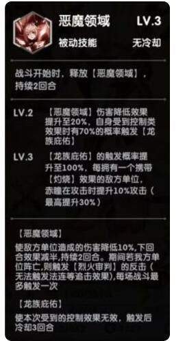 【恶魔领域】使敌方单位造成的伤害降低10%,下回合效果减半,持续两回合。期间若我方单位阵亡,则触发(烈火审判)的反击(无法触发法连等追击效果),每场战斗最多触发一次