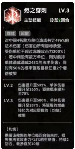 对中间4名敌方单位造成共计496%的法术伤害(伤害由所有目标承受,受伤单位不超过赤瞳攻击力300%);若中间没有敌方单位,则对前排单位造成248%的法术伤害;同时有50%的概率驱散目标任意2个增益效果
