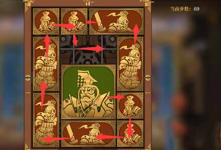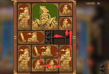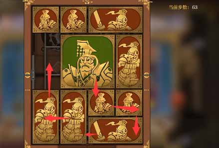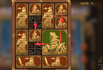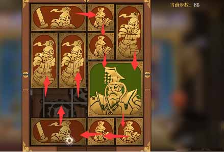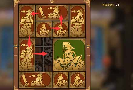 1、左侧中间小方块向上一格,将军向左一格,右上的小方块全部向下移动,右上的竖着方块向右一格。