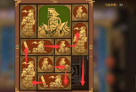 3、左下的小方块移动到左下角,然后水平方块全部左移一格,右侧的全部下到底,上方中间的小方块移动到右侧,将军再向上一格。
