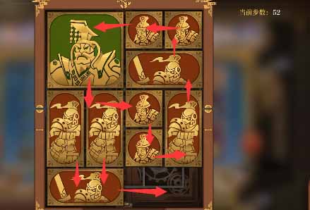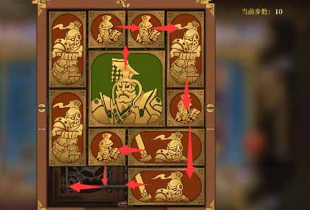 10、然后上方小方块填到中间的空格处,右上的水平方块向中间一格,左右的竖直方块全部向上一格,下方的水平方块再向左一格,右下的小方块水平放置在右下角,将军向右移动一格。