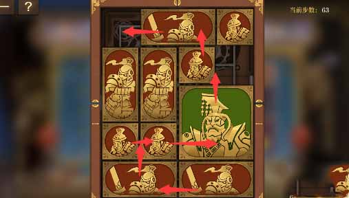 10、下半部分的方块继续顺时针旋转,最后让左下角的小方块全部贴边让将军向左移动一格即可完成本关。