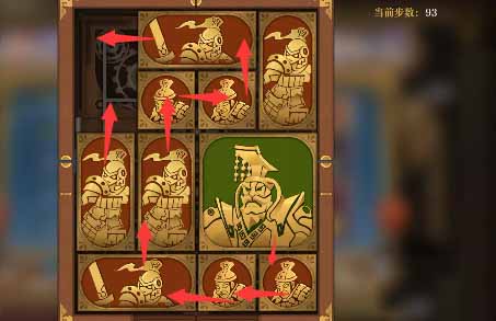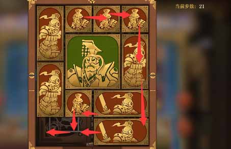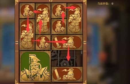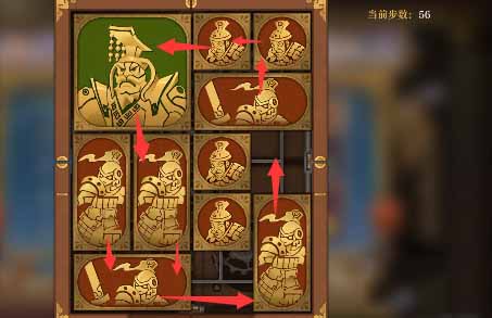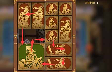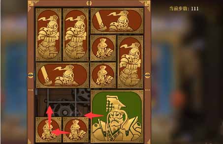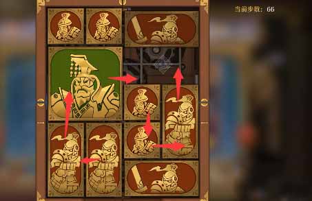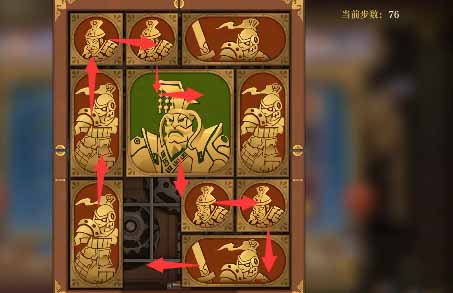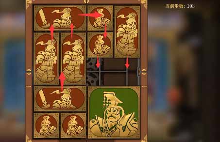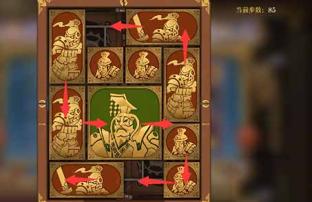 5、将军向上移一格,水平方块全部向上移,然后左下的小方块向右移动,左下竖直方块向下一格,上方的水平方块向左一格,然后右侧中间的小方块向左移一格,右下的竖直方块向上一格。