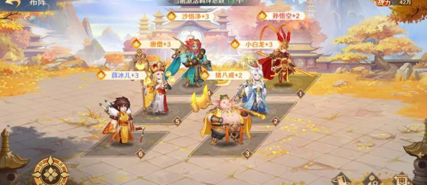 这个阵容的爆发输出能力强,孙悟空触发【复仇】效果可以额外获得行动机会,小白龙和沙悟净的配合在受到攻击的时候有概率触发反击,猪八戒可以提供增益并回复连击点,唐僧还有群体回血能力。