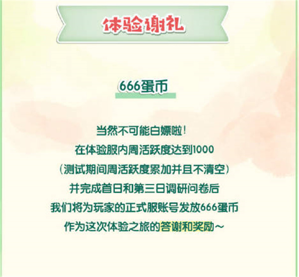 3:测试的时间是在4月13日,在体验服中可以体验到最新的玩法或者没有上线的玩法等等,你在体验服中达到了一千的活跃度;