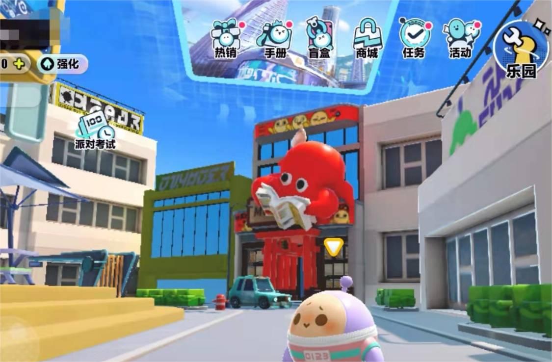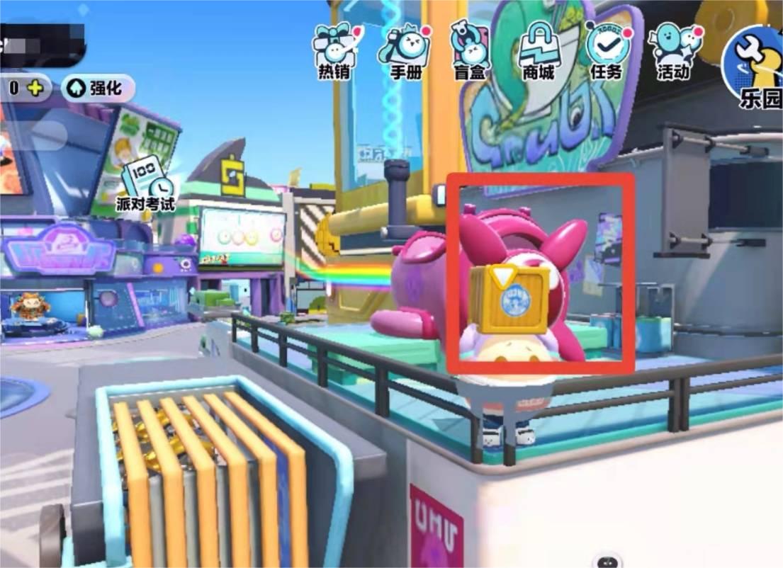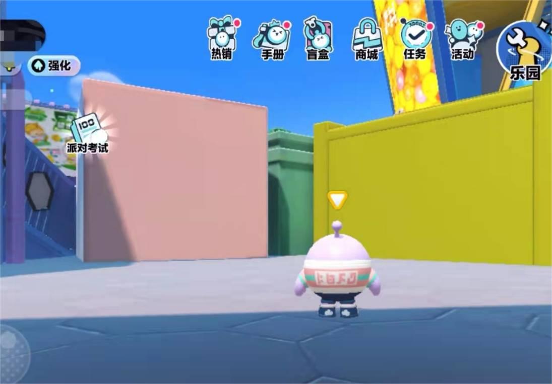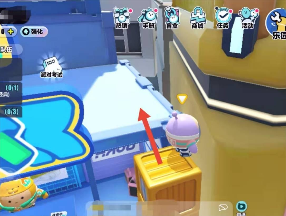 1、首先我们要拿到踮脚箱道具,如果暂时找不到也没关系,四处找一找道具刷新,很容易就能拿到。拿到道具后,来到盲盒商店与旁边蓝色商店的角落,一块一块垒起来,之后跳到蓝色商店的顶部平台,从平台上跳到房子后方,从这里开始,后面就全都是未开发区域了。