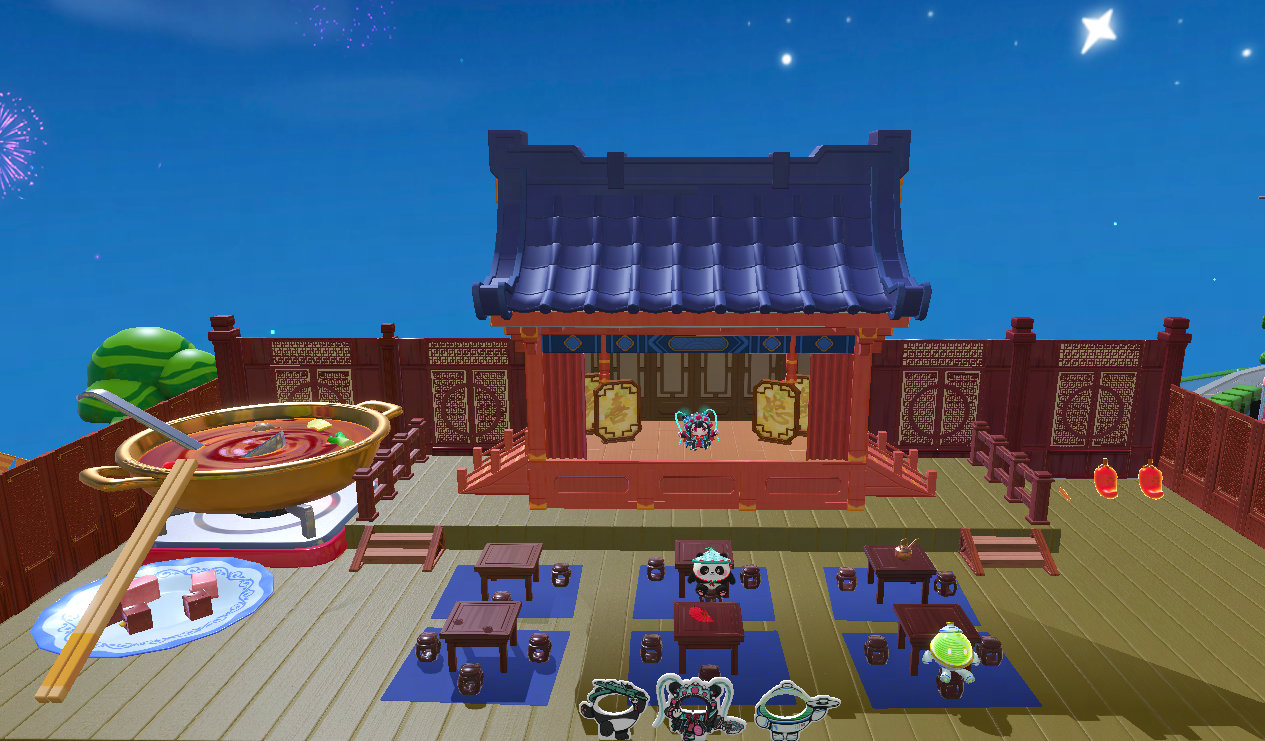 蛋仔岛惊现川剧戏台,古色古香的戏台与屏风,展现古典建筑之美。此处桌椅茶水一应俱全,快来欣赏梧桐的川剧表演吧。