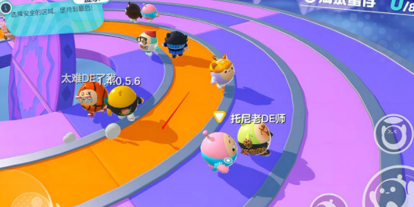 同心圆生存模式关卡地图是由多个圆包裹而成的。这些套起来的圆圈还会不定时的发生旋转,将上面的小蛋仔扔到地上去淘汰掉。