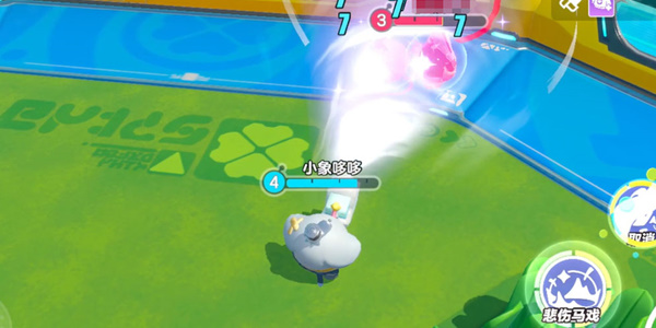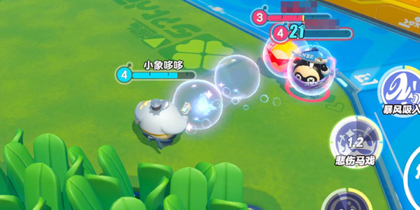 流浪小象哆哆使用泡泡枪吸入空气,对前方持续3秒造成伤害、减速和吸附效果,此时不会击破泡泡且可重置敌人的「浮空」状态;再次点击技能则会取消施法。