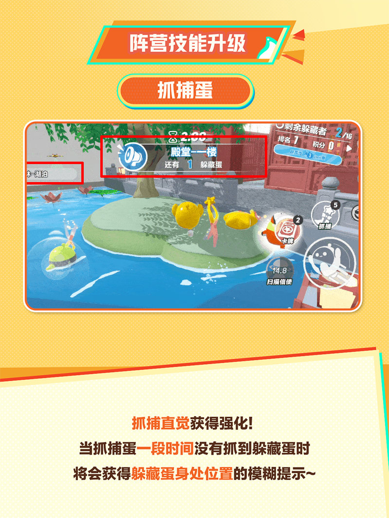 当抓捕蛋一段时间没有抓到躲藏蛋时将会获得躲藏蛋身处位置的模糊提示~