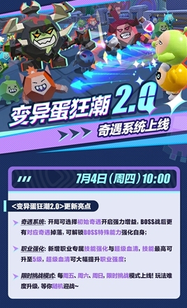 [变异蛋狂潮2.0]新增奇遇系统F游戏开局蛋仔会选择初始奇遇在合作模式下,系统将在两个玩家各自选定的初始奇遇中随机选择一个每个初始奇遇都拥有着非常强大的效果与增益!