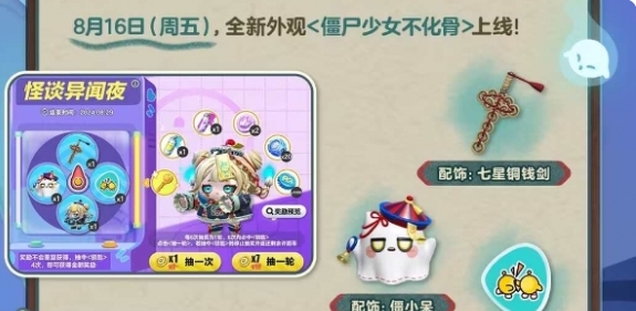 4、卡池奖励包括全新外观-僵尸少女不化骨、配饰-僵小呆、配饰-七星铜钱剑、动作-定身等。