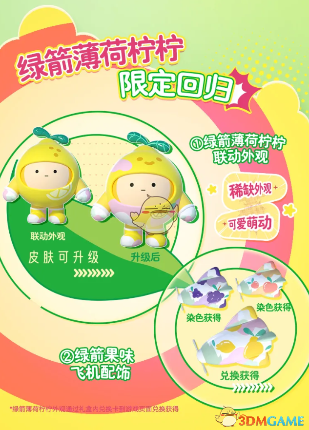 礼盒内包含联动外观绿箭薄荷柠柠以及清新童趣的果味飞机配饰,为游戏体验增添更多乐趣。