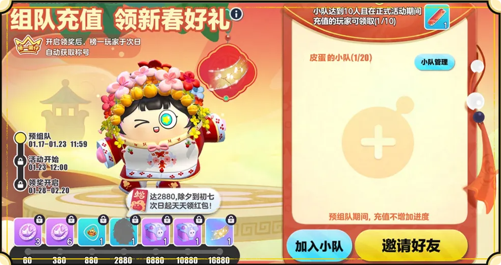 本次新春组队充值队伍上限为20个人,活动开启后充值金额都将记录在累计进度中,当蛋仔累计了充值进度后将不可退出或加入其他队伍,但队长可移出未提供进度的队员。