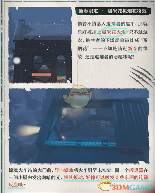 爆米花机和烟花特效将作为新春限定惊喜,出现在「惊魂火车站」和「惊魂马戏团」两张地图中,为玩家营造出欢乐祥和的节日氛围